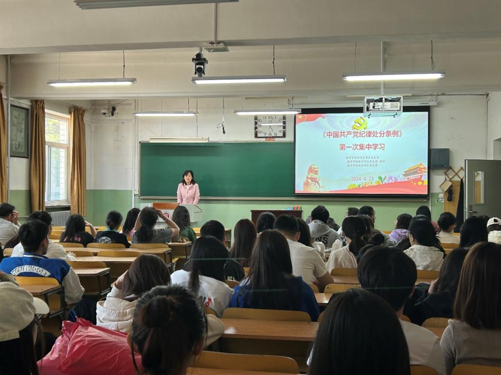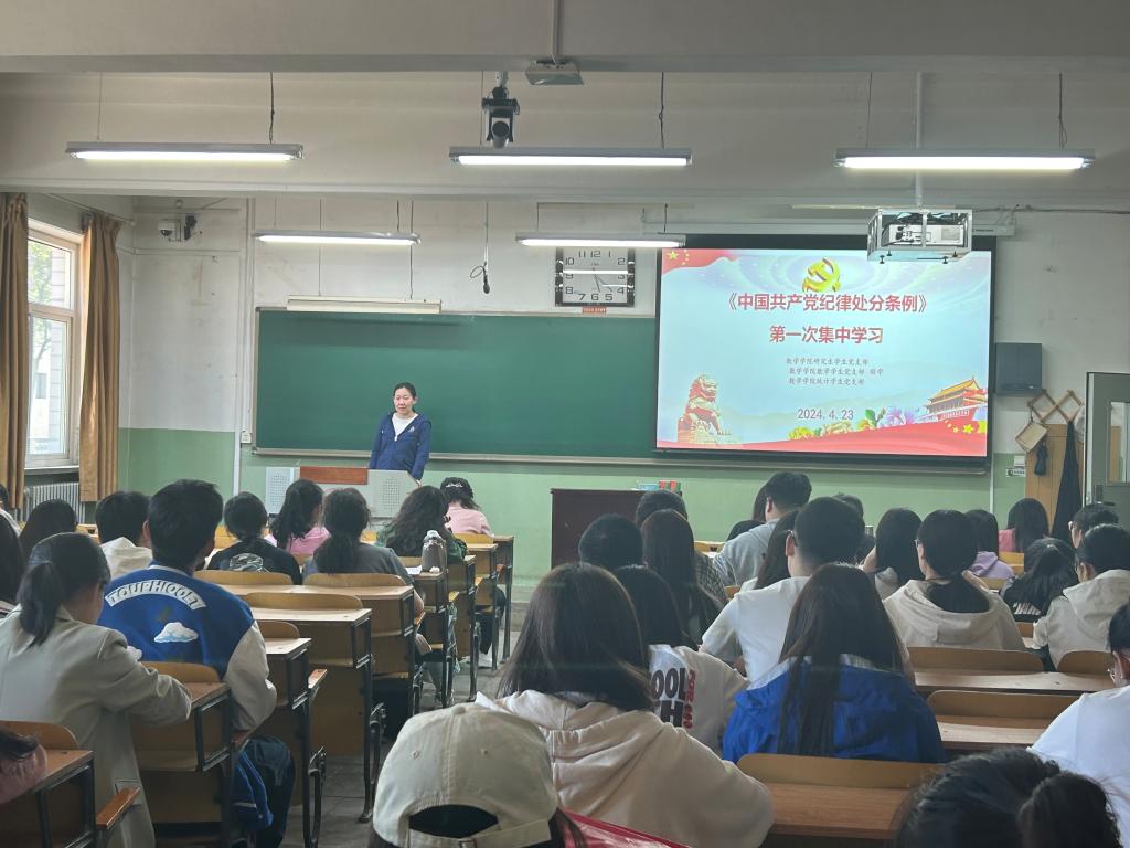 为深入学习贯彻习近平总书记关于党纪学习教育的重要讲话和重要指示精神,认真学习贯彻新修订的《中国共产党纪律处分条例》,2024年4月23日下午,由研究生学生党支部领学,与数学学生党支部、统计学生党支部全体党员集中学习《中国共产党纪律处分条例》(以下简称《条例》)前五章内容。