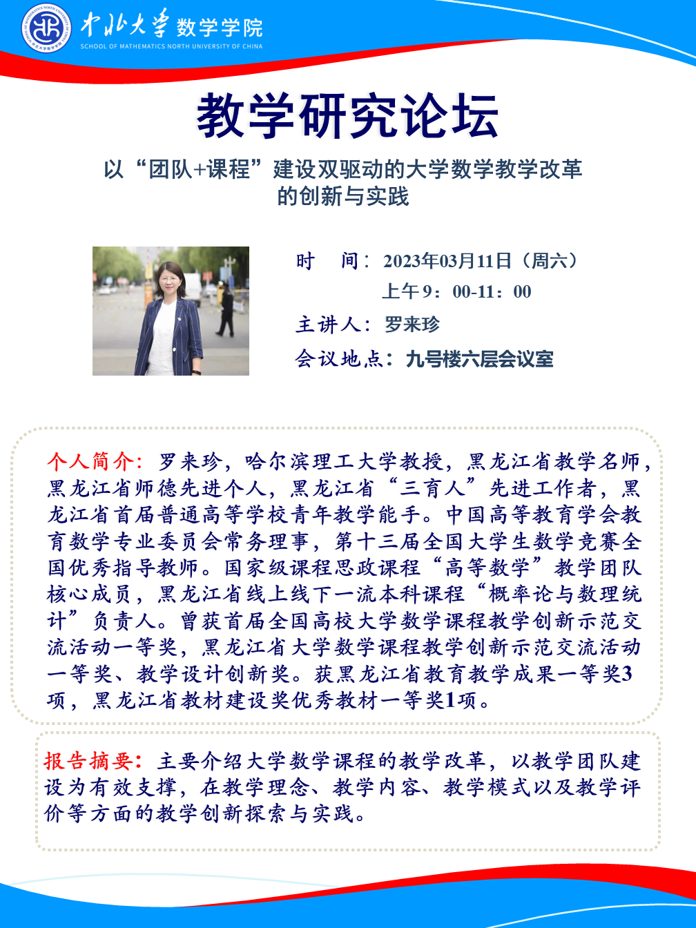 邀请哈尔滨理工大学罗来珍教授做了题为“以‘团队+课程’双驱动的大学数学教学改革的创新与实践”的专题报告。本次论坛在九号楼六层会议室线上线下同步进行。院党委书记薛亚奎教授、副院长王鹏教授、副院长吴森林教授、系主任、课程负责人和部分任课教师参加了本次论坛。论坛由副院长王鹏教授主持。