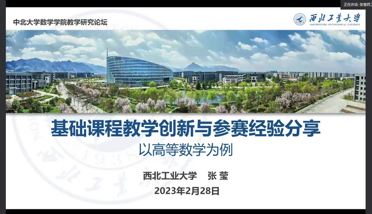 特邀全国高校教师教学创新大赛一等奖获得者、西北工业大学张莹教授,做了题为“基础课程教学创新与参赛经验分享——以高等数学为例”的教学创新报告。本次论坛在九号楼918线上线下同步进行,学院领导和全体教师参加了讨论学习。论坛由副院长王鹏教授主持。