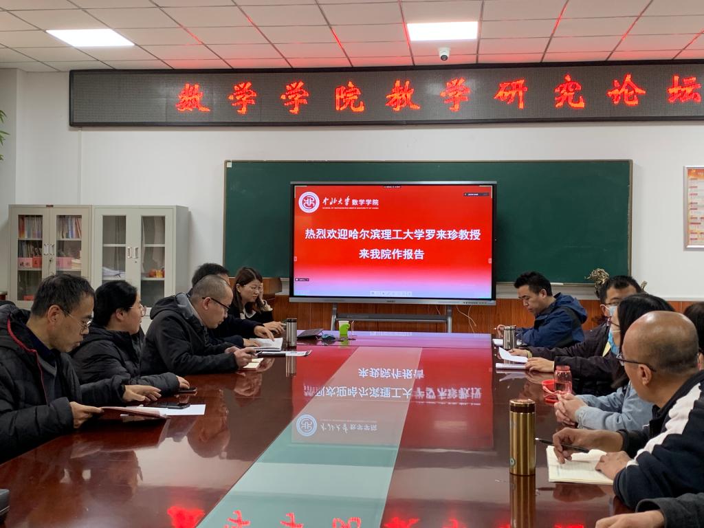 邀请哈尔滨理工大学罗来珍教授做了题为“以‘团队+课程’双驱动的大学数学教学改革的创新与实践”的专题报告。本次论坛在九号楼六层会议室线上线下同步进行。院党委书记薛亚奎教授、副院长王鹏教授、副院长吴森林教授、系主任、课程负责人和部分任课教师参加了本次论坛。论坛由副院长王鹏教授主持。